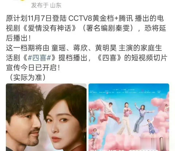 原定的央八黄金档期,已经被央视更换为童谣、蒋欣等人主演的都市生活剧《四喜》,该剧的网络宣传已经开始了。