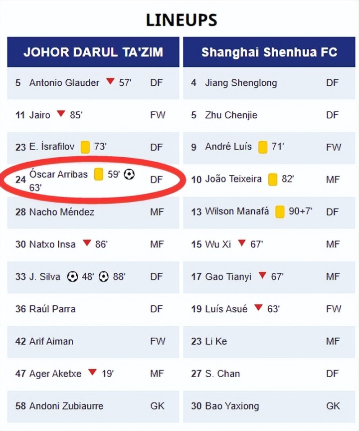 不过这个黄牌数据有出入!比如德转那边的统计,阿里巴本人仅2黄在身,疑点就在柔佛新山对阵上海申花这场比赛中,第59分钟有黄牌未明确显示是给了他。但官方比赛记录中黄牌是发给了他的(下图)。是乌龙,还是黄牌数据无误,这点需要得到亚足联那边的确认。
