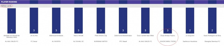 原来亚足联的官网显示,柔佛新山的后卫阿里巴在赛前就已经累积黄牌三张(下图)。按照规则,本轮对阵海港时他应该停赛无缘出场。然而这场对阵海港的比赛,他踢满全场表现积极,为打平海港立下功劳。