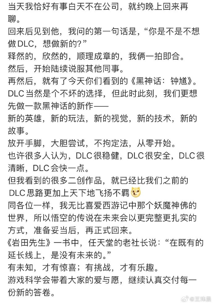 媒体人王玮晨发表了自己的看法:看冯骥这段的意思,黑神话悟空的DLC大概率不会有了。