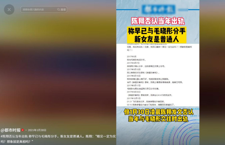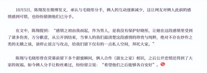 果不其然,几天后,陈翔官宣分手,希望大家不要攻击毛晓彤,但没对外说分手原因。