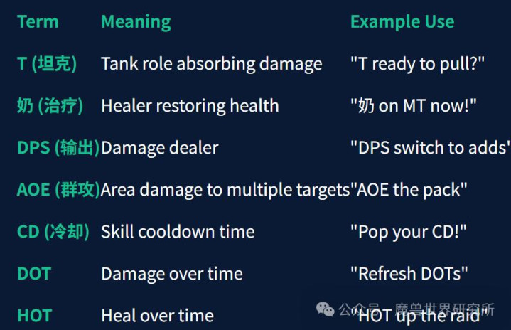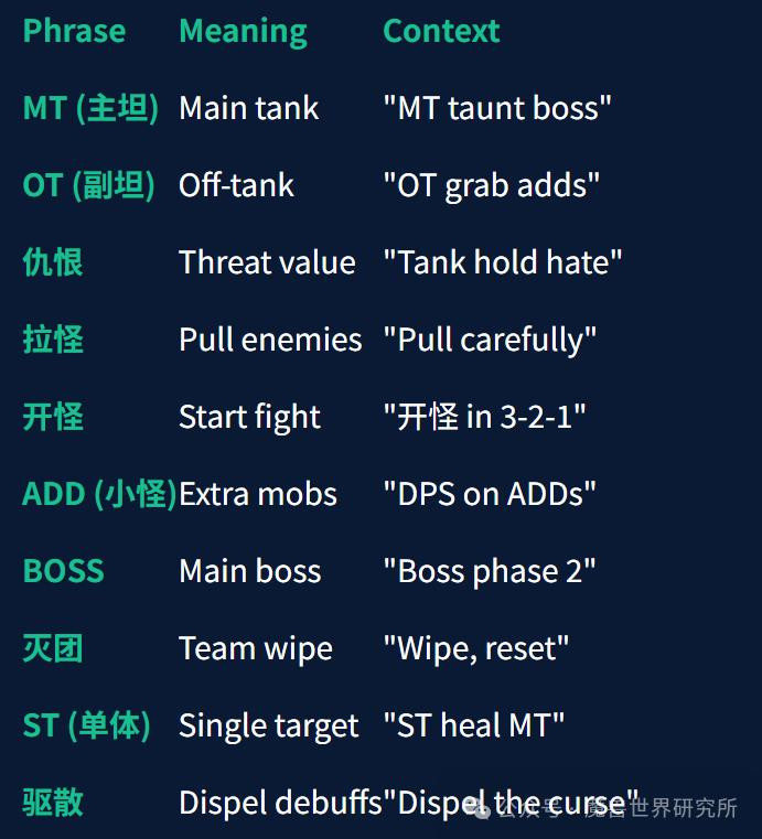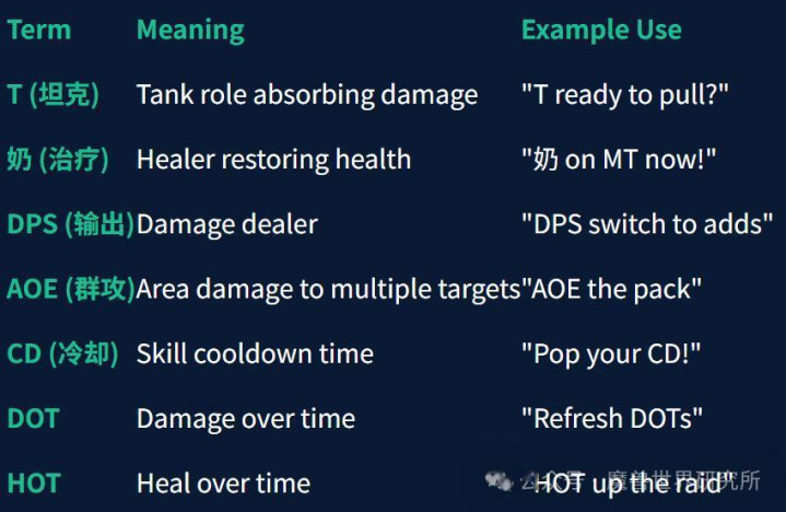 可先在低难度地下城(如 “普通本”)中练习,加入有英文玩家的公会,或反复参考本文这类术语指南。